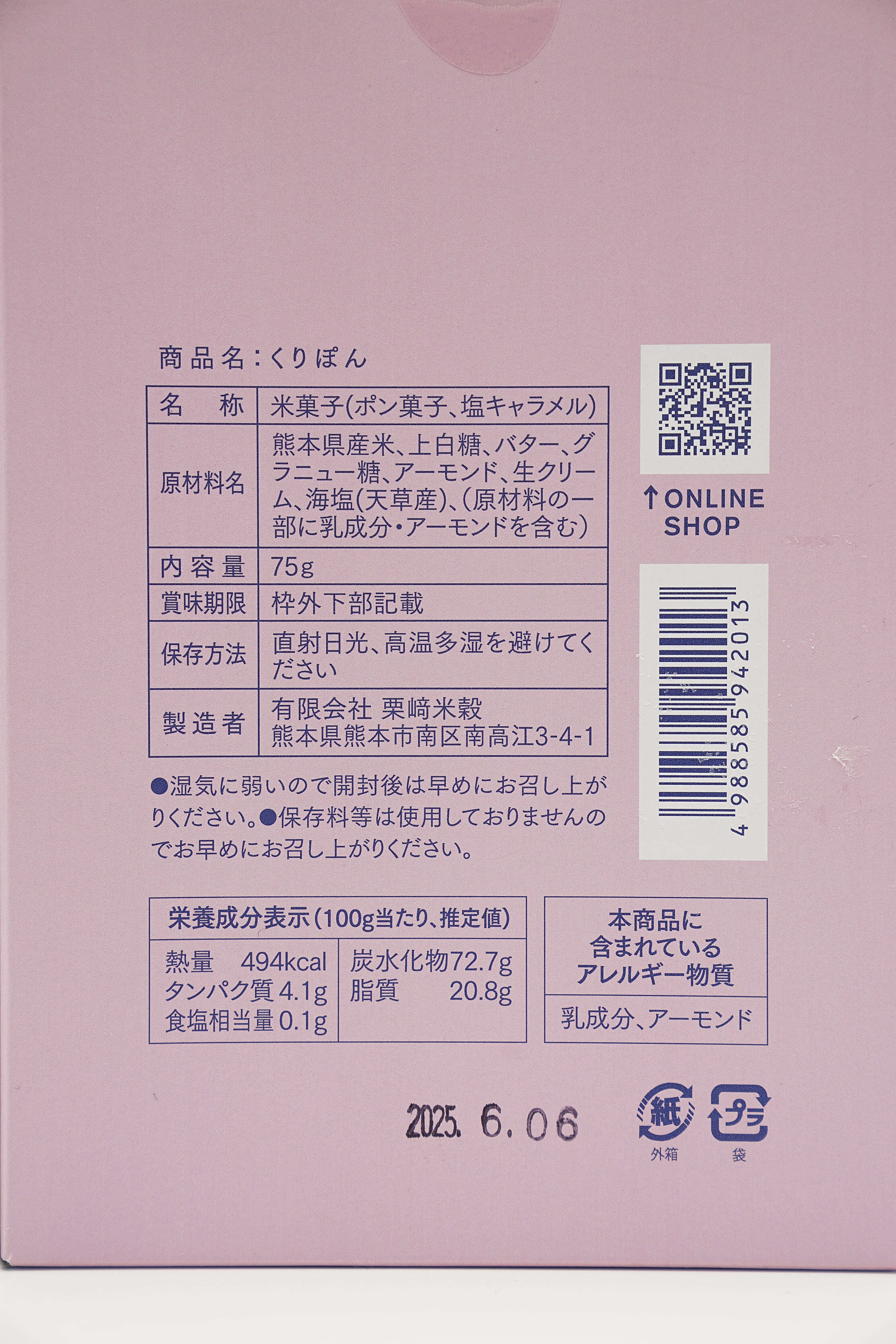 原材料:熊本県産米、上白糖、バター、グラニュー糖、アーモンド、生クリーム、海塩(天草産)、(原材料の一部に乳成分・アーモンドを含む)