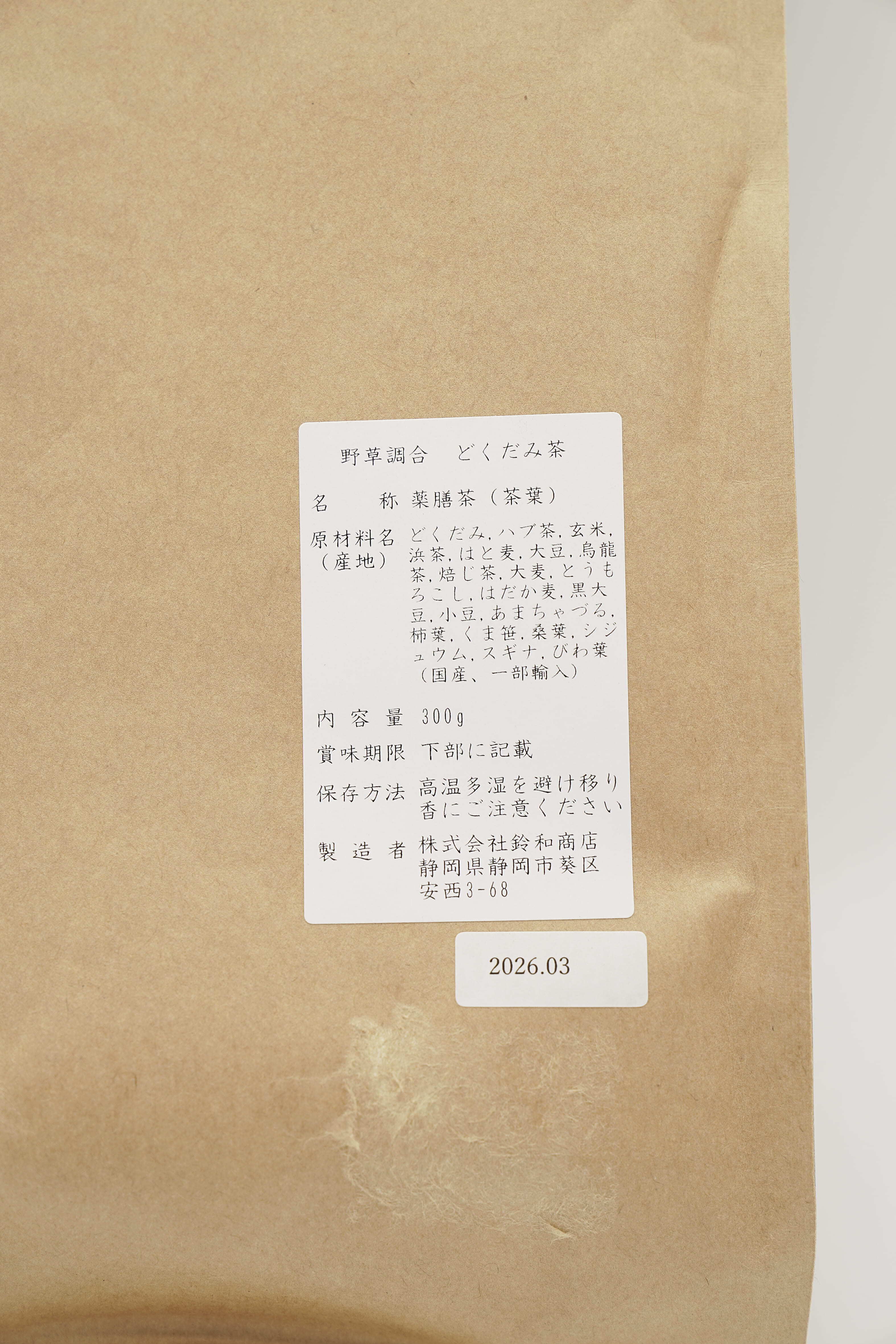 原材料:どくだみ、ハブ、玄米、浜茶、はと麦、大豆、烏龍茶、焙じ茶、大麦、とうもろこし、はだか麦、黒大豆、小豆、あまちゃづる、柿葉、くま笹、桑葉、シジュウム、スギナ、びわ葉(国産、一部輸入)