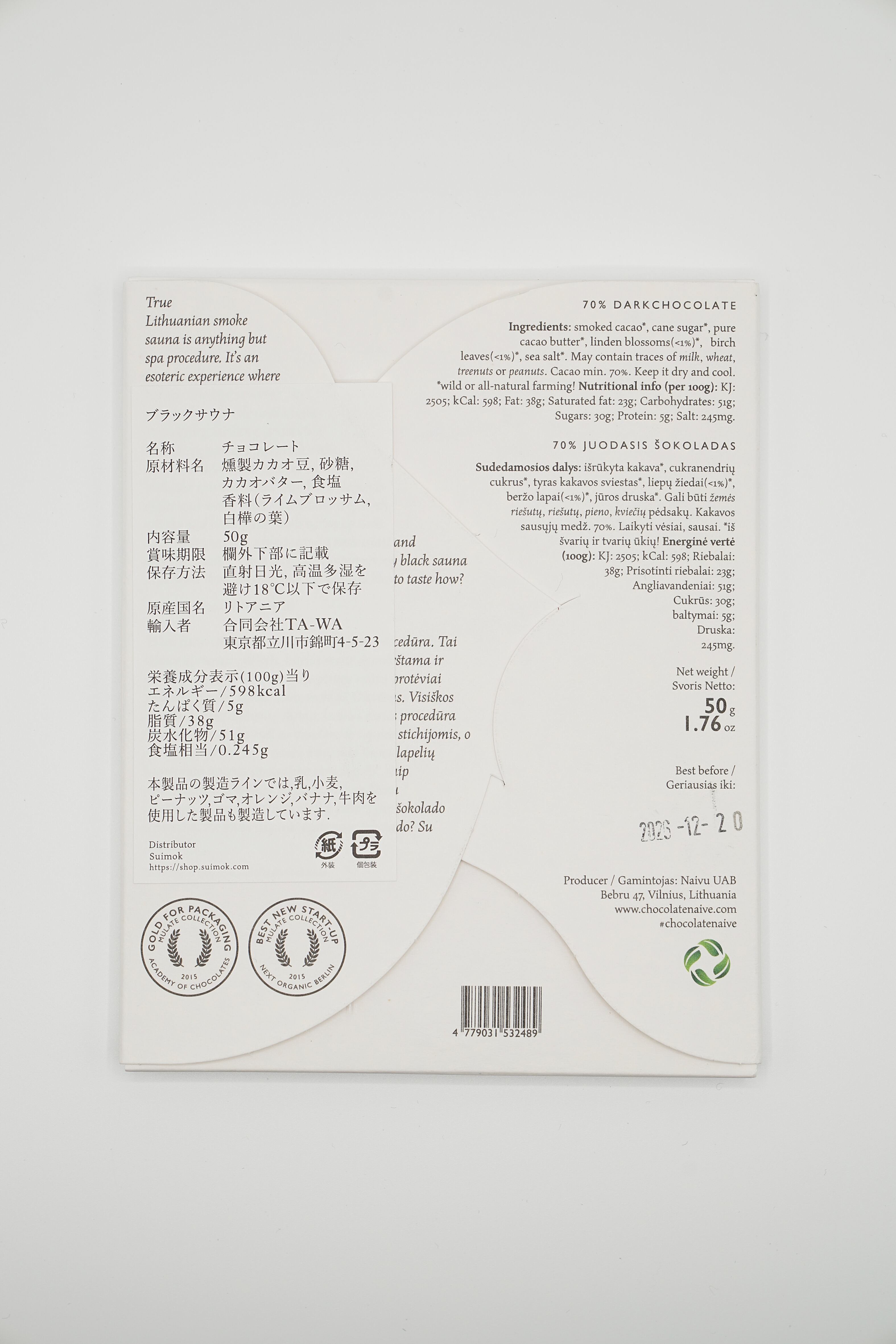 リトアニアに古くから伝わるリトアニア式サウナで燻製にしたスモークカカオを使用し、やさしく香り立つソルトやハーブが隠し味になっています。Cacao 70%で深みがあり甘すぎず、スモーキーな香りで一味違う特別感を味わえるチョコレートです。日本では珍しいリトアニアのスモーキーなチョコレートは、チョコレートが好きな方へのギフトや、自分への心を満たすひと品としてもおすすめです。