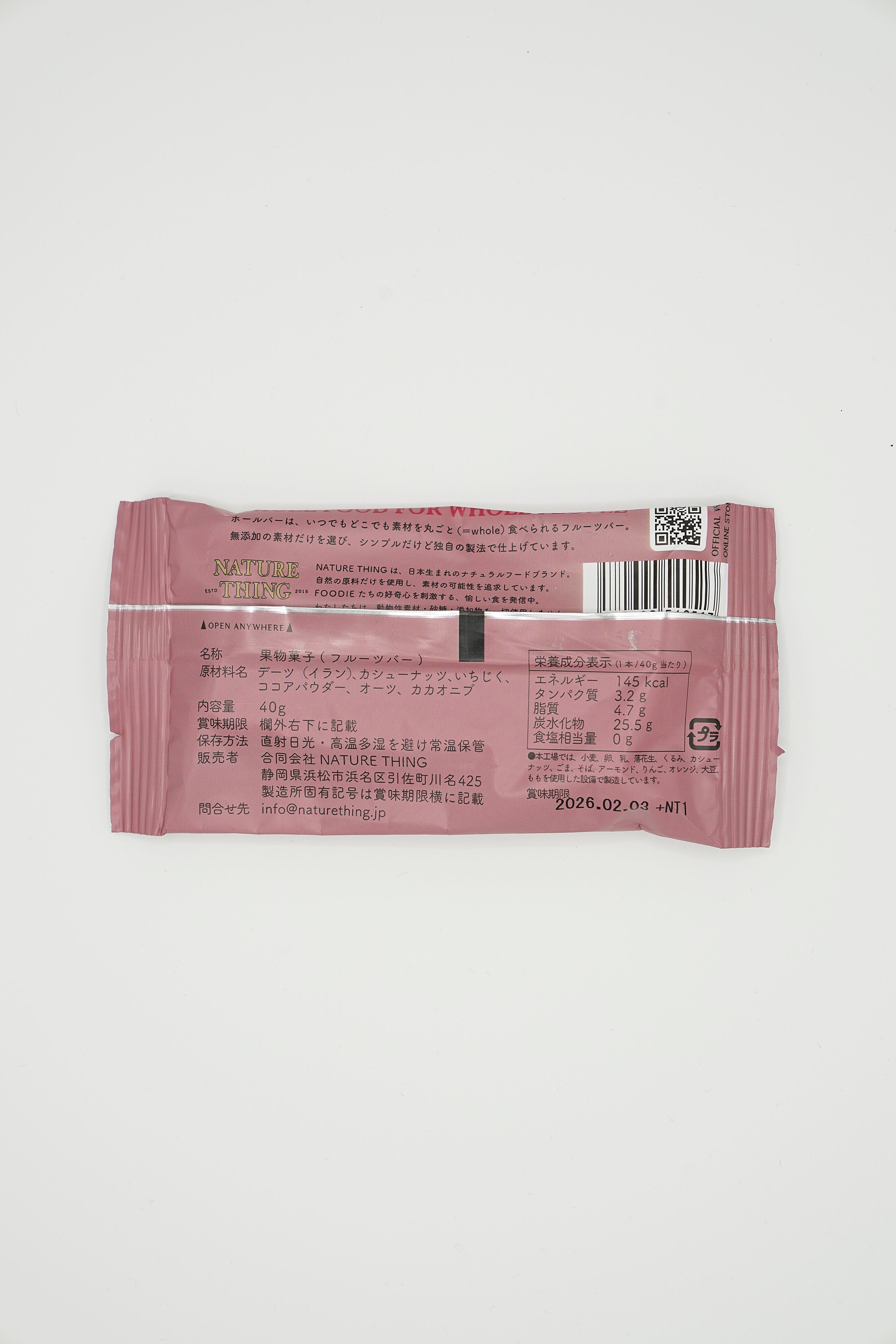 原材料:デーツ(イラン産)、カシューナッツ、いちじく、ココアパウダー、オーツ、カカオニブ