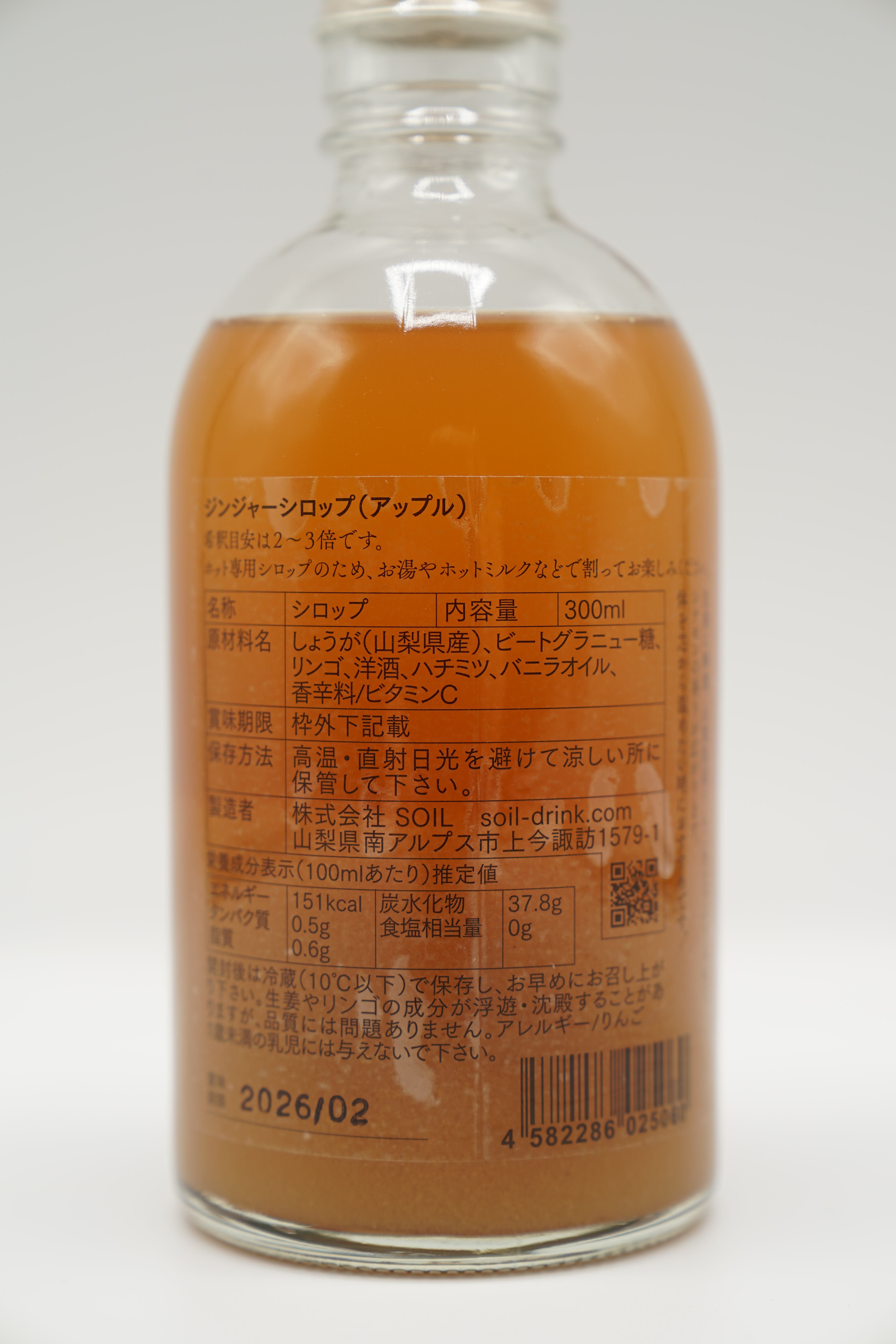 原材料:しょうが(山梨県産)、ビートグラニュー糖、リンゴ、洋酒、ハチミツ、バニラオイル、香辛料/ビタミンC