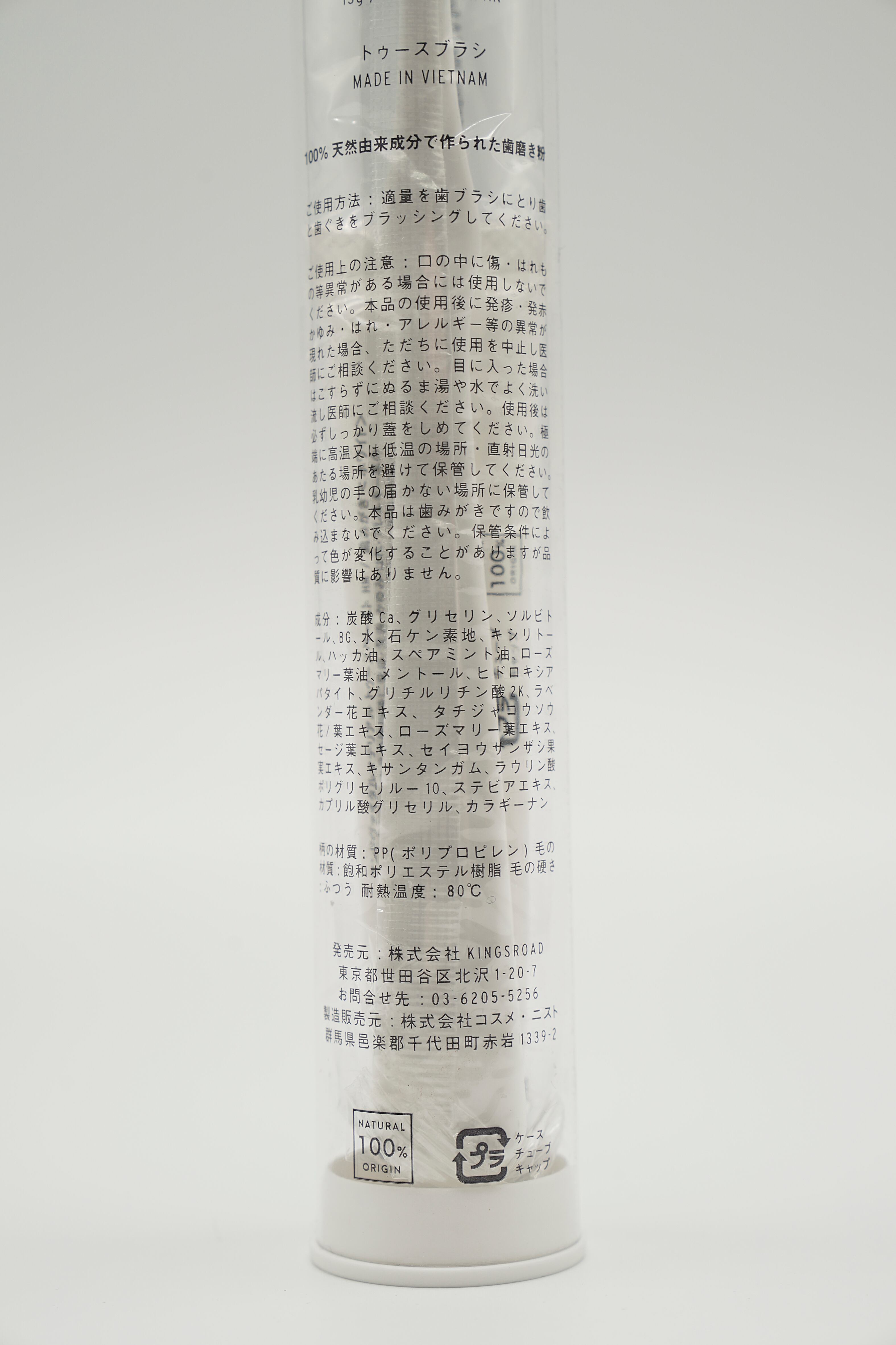 原材料:炭酸Ca、グリセリン、ソルビトール、BG、水、石ケン素地、キシリトール、ハッカ油、スペアミント油、インドレモングラス油、ベルガモット果実油、メントール、グリチルリチン酸2K、ラベンダー花エキス、タチジャコウソウ花・葉エキス、ローズマリー葉エキス、セージ葉エキス、セイヨウサンザシ果実エキス、キサンタンガム、ラウリン酸ポリグリセリル-10、ステビアエキス、カプリル酸グリセリル、カラギーナン【フリー成分】石油系界面活性剤、シリコン、パラベン、合成着色料、合成香料、鉱物油、アルコール (エタノール)、紫外線吸収剤不使用【オーガニック原料】ラベンダー花エキス、タチジャコウソウ花・葉エキス、ローズマリー葉エキス、セージ葉エキス、セイヨウサンザシ果実エキス