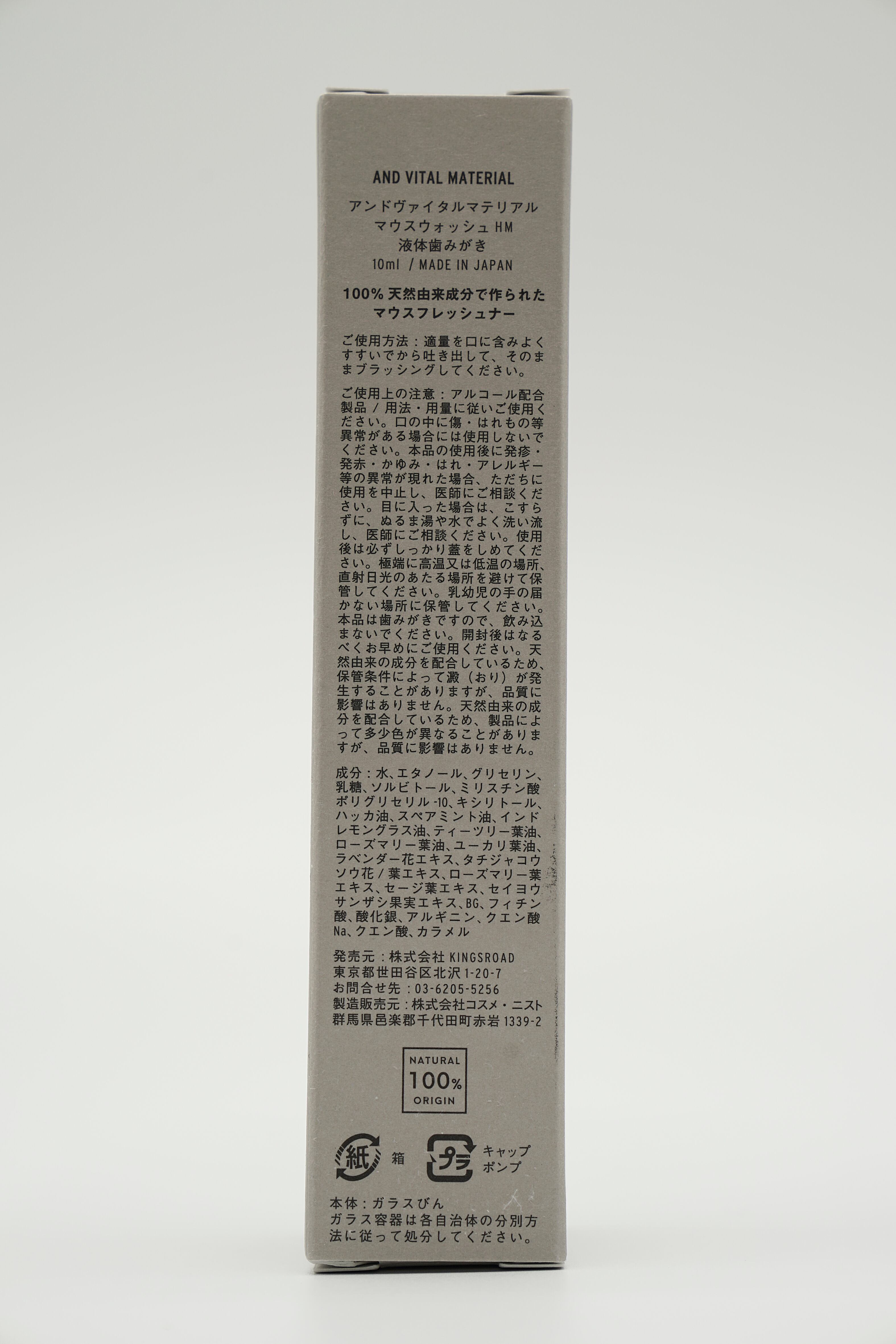 原材料:水、エタノール、グリセリン、乳糖、ソルビトール、ミリスチン酸ポリグリセリル-10、キシリトール、ハッカ油、スペアミント油、インドレモングラス油、ティーツリー葉油、ローズマリー葉油、ユーカリ葉油、ラベンダー花エキス、タチジャコウソウ花・葉エキス、ローズマリー葉エキス、セージ葉エキス、セイヨウサンザシ果実エキス、BG、フィチン酸、酸化銀、アルギニン、クエン酸Na、クエン酸、カラメル【フリー成分】石油系界面活性剤、シリコン、パラベン、合成着色料、合成香料、鉱物油、アルコール (エタノール)、紫外線吸収剤不使用【オーガニック成分】ラベンダー花エキス、タチジャコウソウ花・葉エキス、ローズマリー葉エキス、セージ葉エキス、セイヨウサンザシ果実エキス