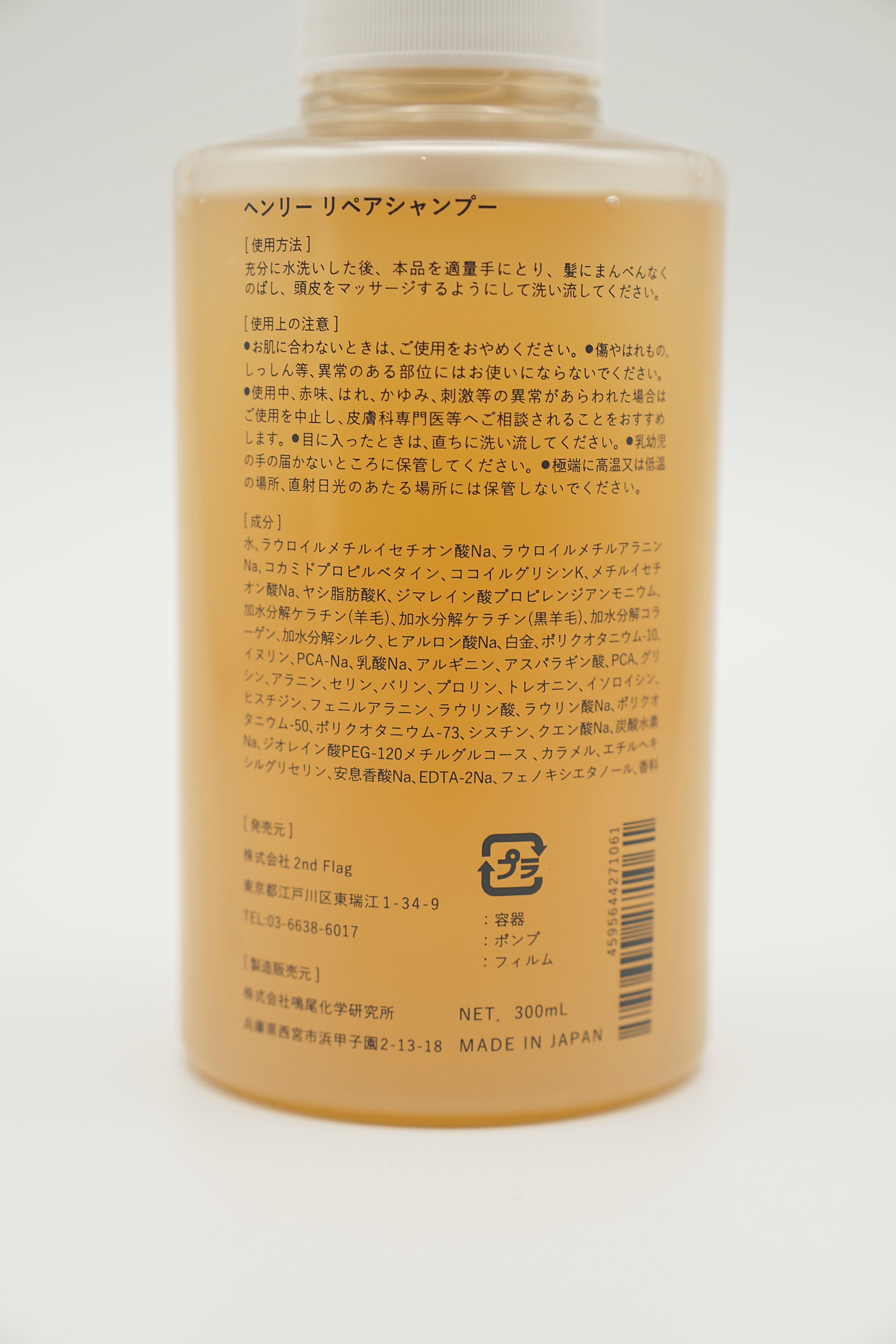原材料:水、ラウロイルメチルイセチオン酸Na、ラウロイルメチルアラニン Na、コカミドプロピルベタイン、ココイルグリシンK、メチルイセチ オン酸Na、ヤシ脂肪酸K、ジマレイン酸プロピレンジアンモニウム、 加水分解ケラチン(羊毛)、加水分解ケラチン(黒羊毛)、加水分解コラ ーゲン、加水分解シルク、ヒアルロン酸Na、白金、ポリクオタニウム-10、 イヌリン、PCA-Na、乳酸Na、アルギニン、アスパラギン酸、PCA、グリ シン、アラニン、セリン、バリン、プロリン、トレオニン、イソロイシン、 ヒスチジン、フェニルアラニン、ラウリン酸、ラウリン酸Na、ポリクオ タニウム-50、ポリクオタニウム-73、シスチン、クエン酸Na、炭酸水素 Na、ジオレイン酸PEG-120メチルグルコース 、カラメル、エチルヘキ シルグリセリン、安息香酸Na、EDTA-2Na、フェノキシエタノール、香料