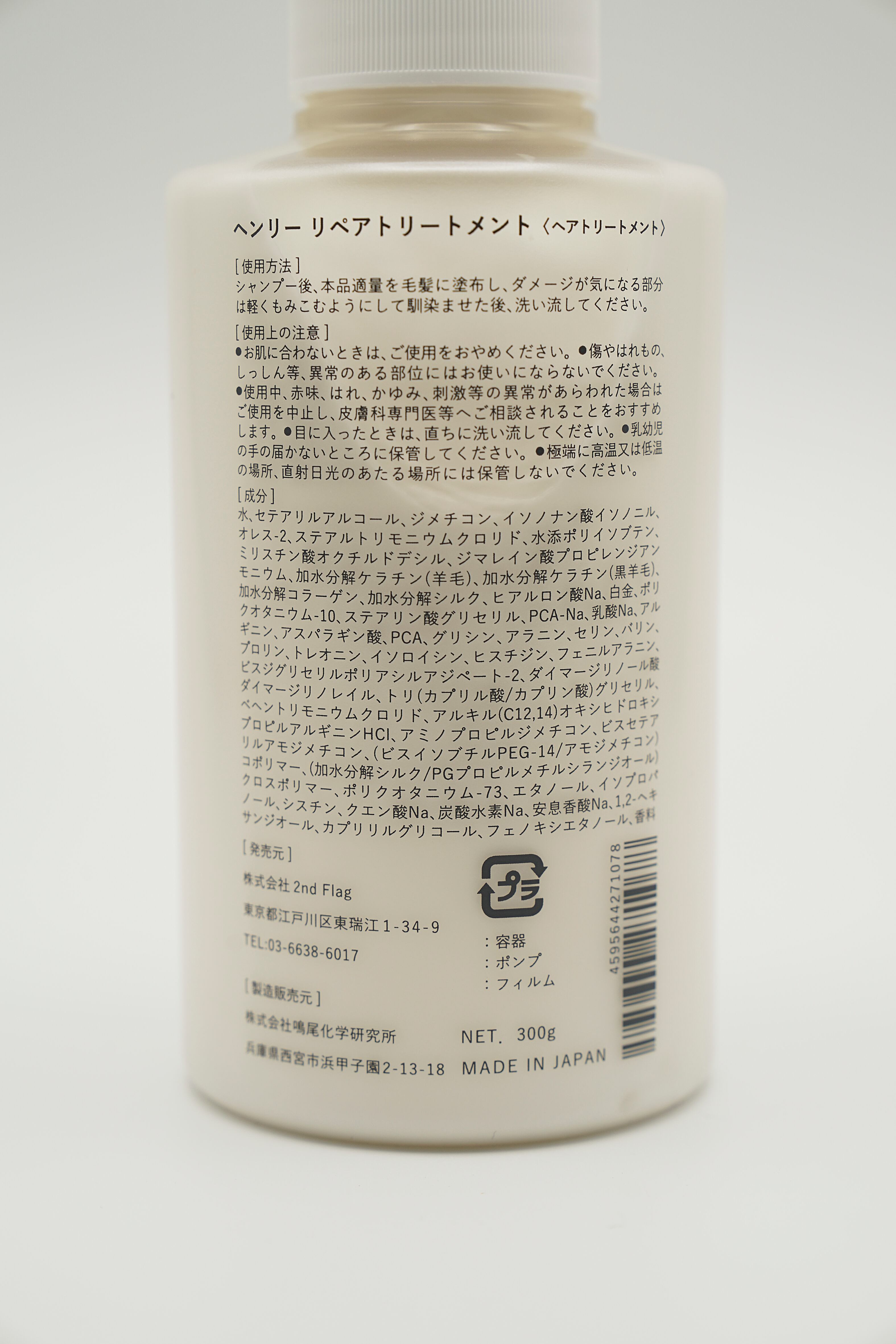 原材料:水、セテアリルアルコール、ジメチコン、イソノナン酸イソノニル、 オレス-2、ステアルトリモニウムクロリド、水添ポリイソブテン、 ミリスチン酸オクチルドデシル、ジマレイン酸プロピレンジアン モニウム、加水分解ケラチン(羊毛)、加水分解ケラチン(黒羊毛)、 加水分解コラーゲン、加水分解シルク、ヒアルロン酸Na、白金、ポリ クオタニウム-10、ステアリン酸グリセリル、PCA-Na、乳酸Na、アル ギニン、アスパラギン酸、PCA、グリシン、アラニン、セリン、バリン、 プロリン、トレオニン、イソロイシン、ヒスチジン、フェニルアラニン、 ビスジグリセリルポリアシルアジペート-2、ダイマージリノール酸 ダイマージリノレイル、トリ(カプリル酸/カプリン酸)グリセリル、 ベヘントリモニウムクロリド、アルキル(C12,14)オキシヒドロキシ プロピルアルギニンHCl、アミノプロピルジメチコン、ビスセテア リルアモジメチコン、(ビスイソブチルPEG-14/アモジメチコン) コポリマー、(加水分解シルク/PGプロピルメチルシランジオール) クロスポリマー、ポリクオタニウム-73、エタノール、イソプロパ ノール、シスチン、クエン酸Na、炭酸水素Na、安息香酸Na、1,2-ヘキ サンジオール、カプリリルグリコール、フェノキシエタノール、香料